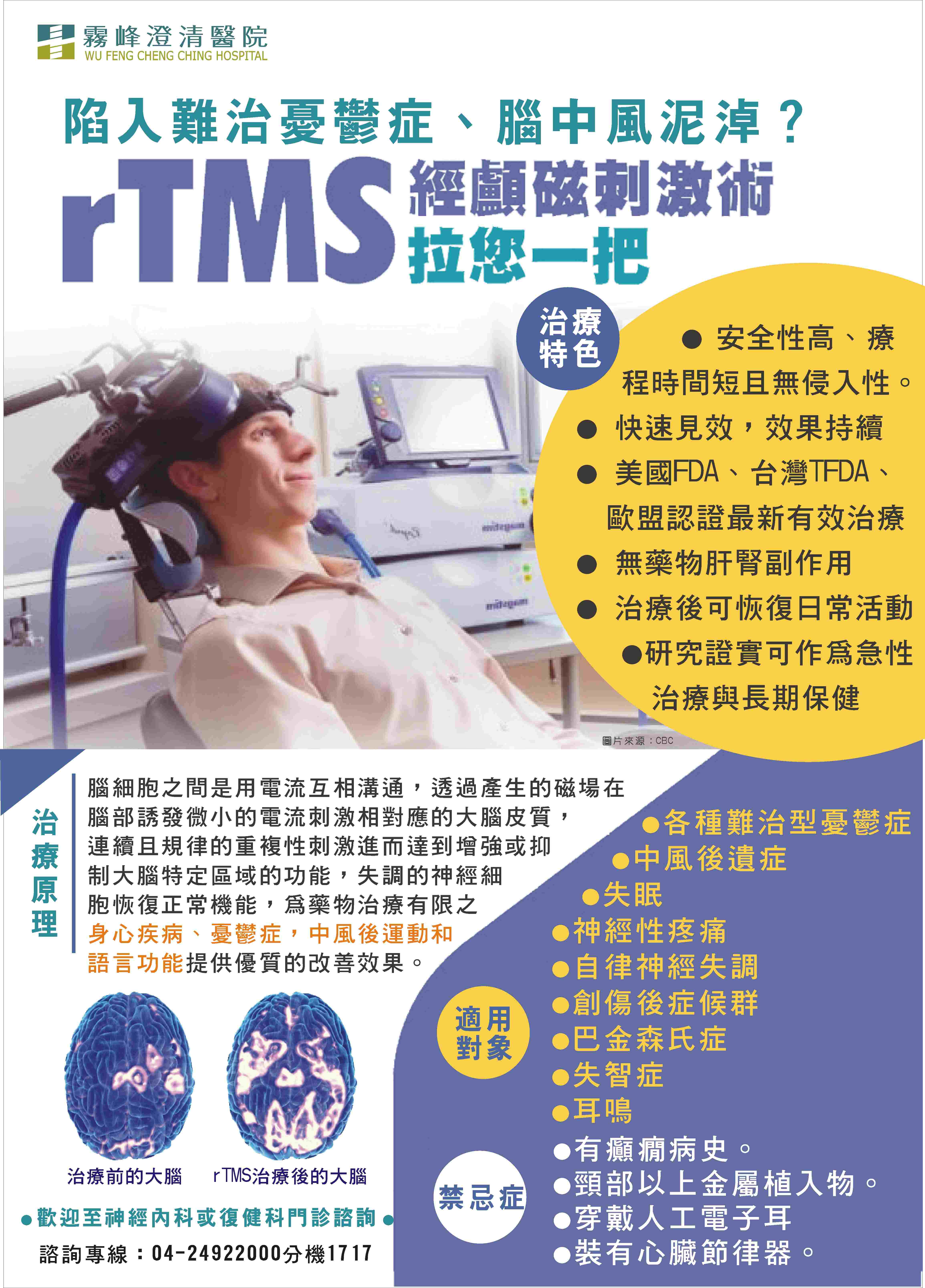 本院引進新型rTMS,改善憂鬱症、腦中風之病患,請洽本院神經內科門診